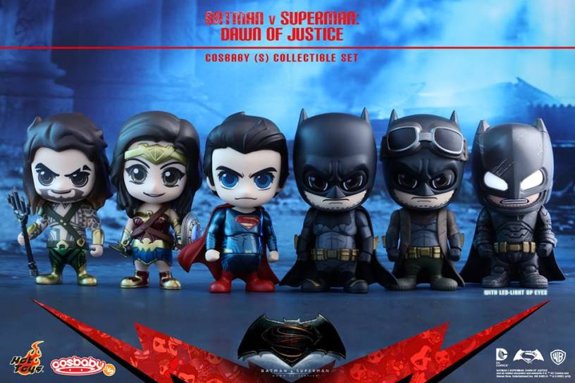 Essa coleção de Cosbaby da Hot Toys é a melhor que foi lançada até agora, com Superman, Wonder Woman, Batman, Armored Batman (Battle Damaged Version), Knightmare Batman, e Aquaman do filme Batman v Superman: Dawn of Justice;