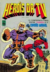 1973) e o personagem foi criado por Jim Starlin. As primeiras “sagas” do personagem contra o Capitão Marvel e Adam Warlock foram publicadas originalmente entre 1973 e 1977, nos EUA, e parte delas saiu no Brasil na revista Heróis da TV, da Editora Abril, e que compiladas posteriormente, com outras que não haviam sido publicadas antes, resultaram na minissérie em cinco edições A Saga de Thanos.