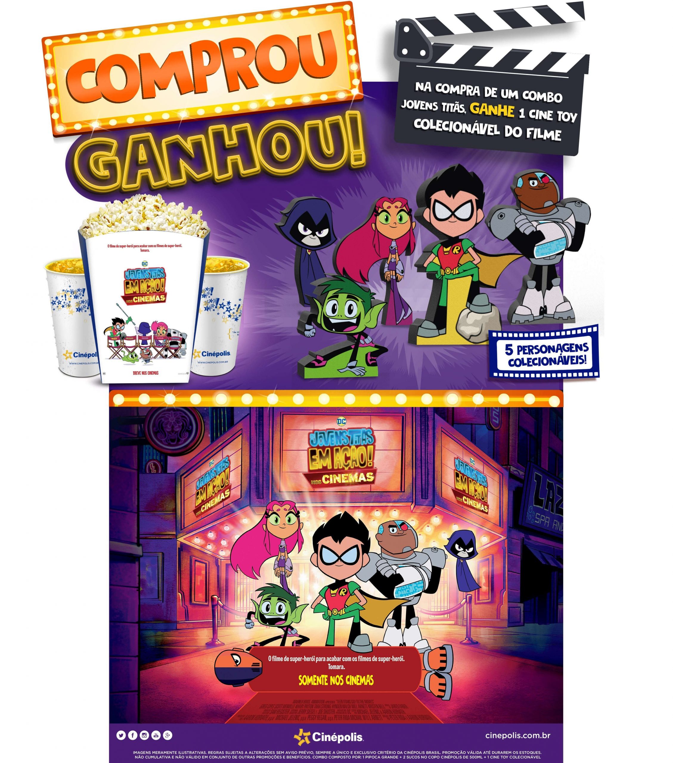 A rede Cinépolis inicia no dia 26 de julho a venda do combo promocional com embalagem exclusiva do filme “Jovens Titãs Em Ação! Nos Cinemas” que tem como brinde 1 Cine Toy Colecionável.