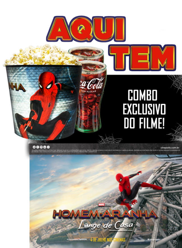A rede Cinépolis inicia no dia 04 de julho a venda do combo promocional de “Homem-Aranha: Longe de Casa”, composto por um balde de 4 litros metalizado, pipoca e duas bebidas.