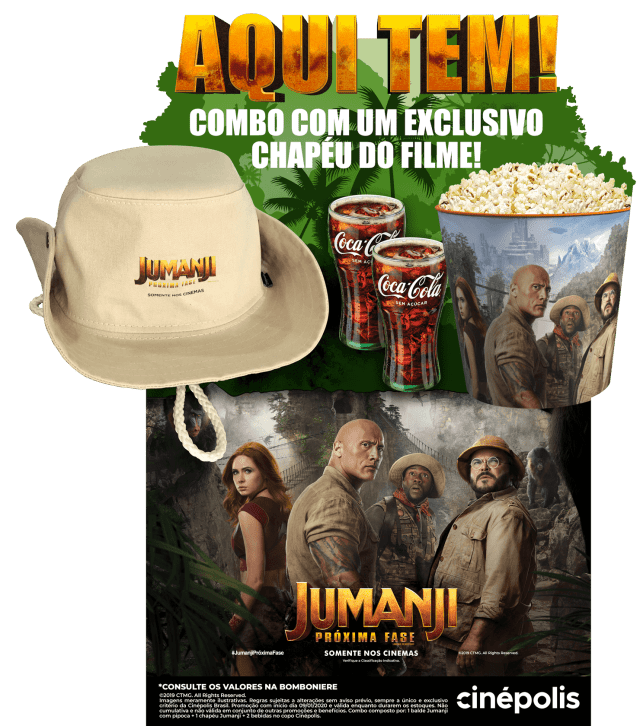 O Combo especial está totalmente tematizado e com um super brinde. Composto por um balde com 4L de pipoca + 1 chapéu Jumanji + 2 bebidas é a opção certa para quem quer se aventurar em Jumanji.