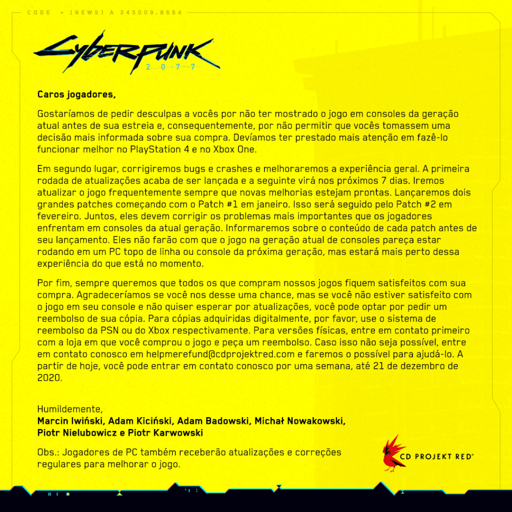 A CD Projekt Red, desenvolvedora de Cyberpunk 2077, publicou um comunicado pedindo desculpas pelo desempenho do jogo.