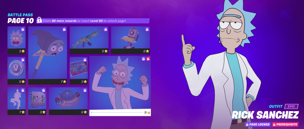 O visual de Rick faz parte do Passe de Batalha da Temporada 7 e está listado na Página 10 de recompensas, custando 9 Estrelas de Batalha.