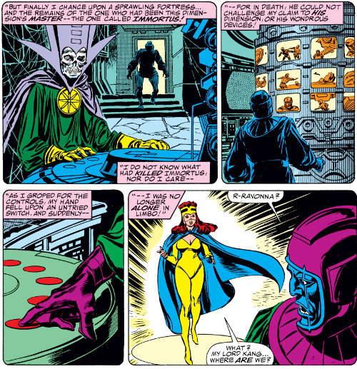 Kang é obcecado pela princesa Ravonna, herdeira do último reino da Terra do século 40, mas ela acabou morta por traidores do reino, algo que Kang e os Vingadores não puderam impedir. Só que a personagem retornou várias vezes as histórias e, em algumas versões Ravonna foi uma vilã.