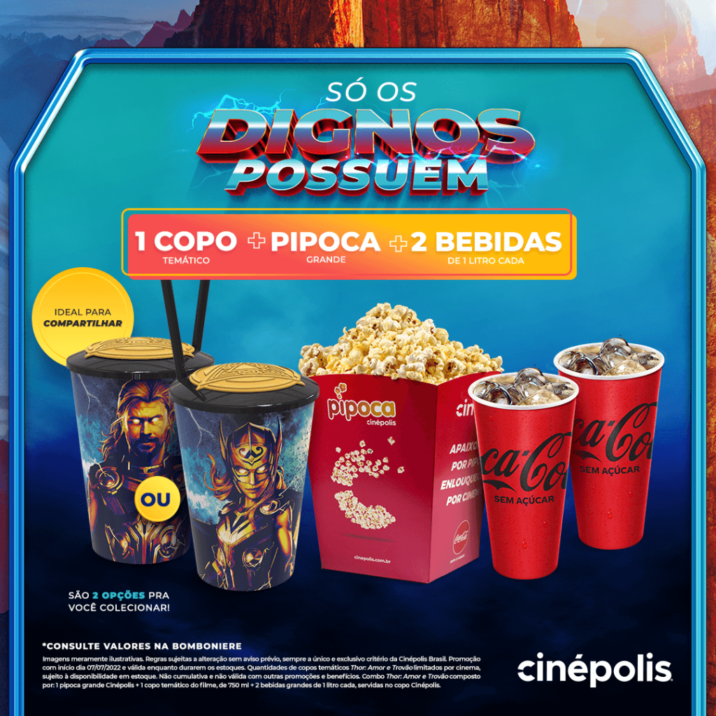 A novidade é que a Cinépolis preparou dois copos personalizados do filme com as artes do Thor e de Jane Foster. O combo é composto por um dos copos temáticos, uma pipoca grande e duas bebidas grandes de 1 litro cada.