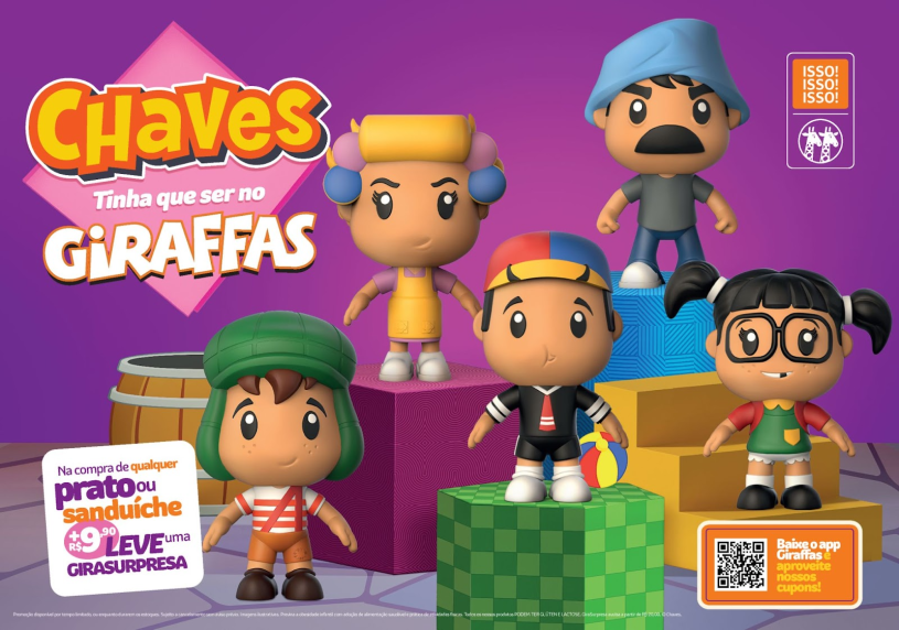 Chega no Giraffas os brindes do Chaves, os consumidores da maior franquia de alimentação completa do país poderão encontrar 5 miniaturas diferentes do seriado mexicano: Chaves, Quico, Chiquinha, Seu Madruga e Dona Florinda.