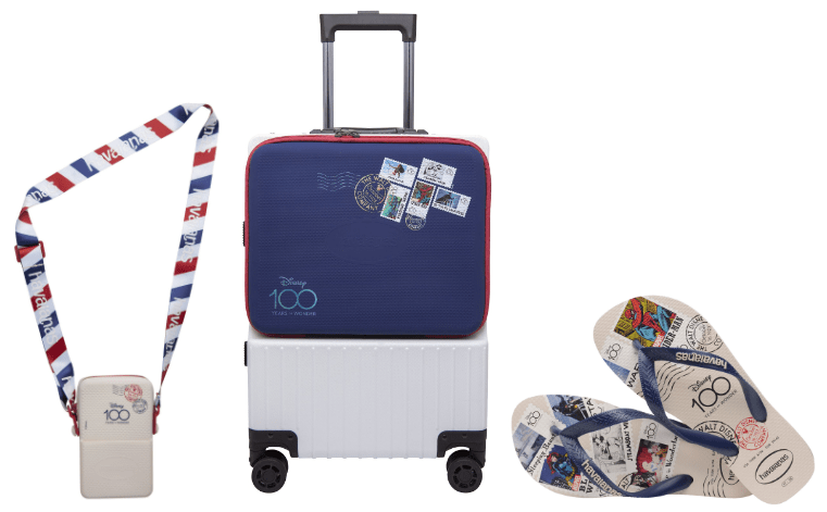 A coleção completa Havaianas Disney 100 foi desenvolvida a quatro mãos com o time da Disney e Havaianas. As estampas temáticas e exclusivas representam uma linha do tempo que ilustra o passado, o presente e o futuro na história da Disney. São treze produtos, sendo cinco sandálias e oito acessórios, entre malas, bags e pins. O ponto alto da coleção é a Mala de Viagem Havaianas Disney 100, que faz o match perfeito com a Shoulder Bag Havaianas Disney 100.