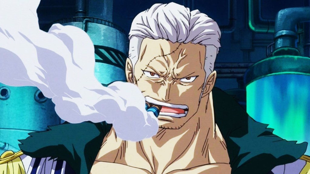 Durante a cena final da série live-action de One Piece um personagem de cabelo branco, luvas marrons e dois charutos aparece, que na verdade é Smoker, o Caçador Branco.