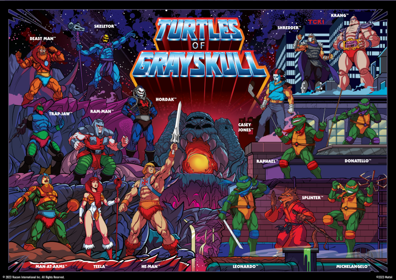 A parceria permite que os fãs e saudosistas criem novas e inúmeras possibilidades com a linha que veste personagens como Leonardo e Rafael, Donatello e Michelangelo com equipamentos de batalha no estilo de Eternia, enquanto o heróico He-Man de Mestres do Universo lutará contra sua própria Mutação Mutagênica. Já o vilão Esqueleto vestirá uma armadura inspirada no visual das tartarugas. A fusão desses mundos, ambos narrativamente repletos de possibilidades criativas, abre ainda mais oportunidades de contar histórias para os fãs de ambas as marcas.