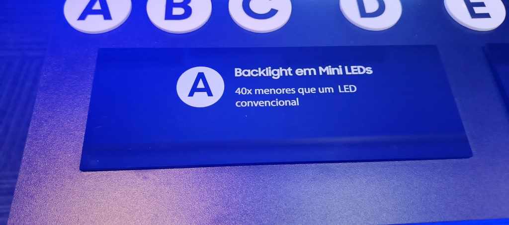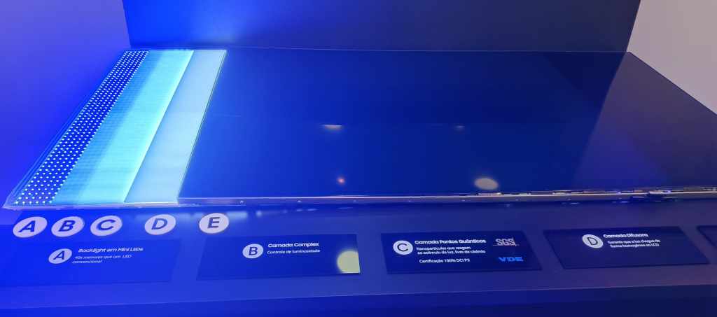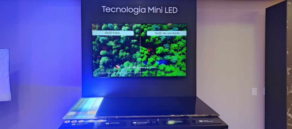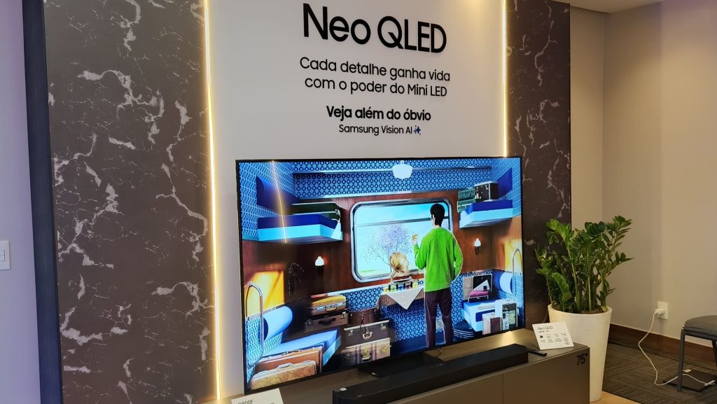 A linha Neo QLED apresenta cores intensas, sendo ideal para salas ou ambientes muito claros. Nela foi possível ver com clareza as imagens mesmo em momentos que simulavam excesso de luz e reflexos na tela. Isso ocorre pelos Mini LEDs que compõem as camadas da tela e que permitem um controle de luz mais preciso.