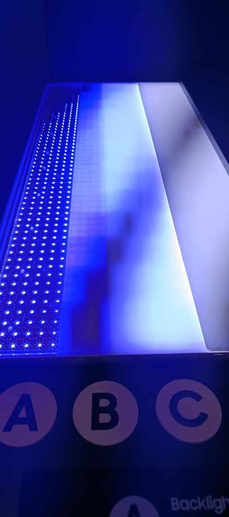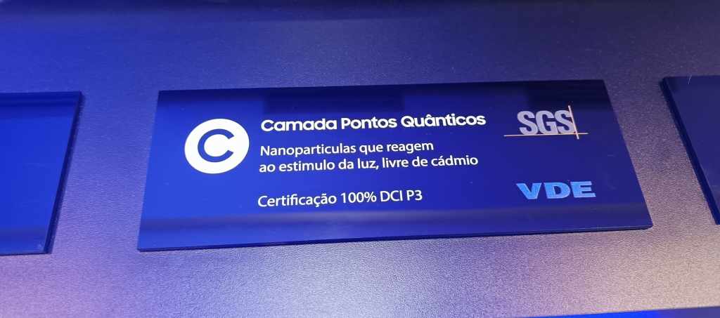 Antes de saber o tamanho da tela precisamos entender como funciona o – Quantum Dot Light-Emitting Diode – da QLED Ultra. A tecnologia utiliza pontos quânticos inorgânicos para aumentar a pureza das cores, proporcionando imagens vibrantes mesmo em ambientes muito iluminados. Por não conter substâncias tóxicas como o cádmio (Cd), a tecnologia da Samsung é mais segura e sustentável, assim como garante também uma longa vida útil ao painel.